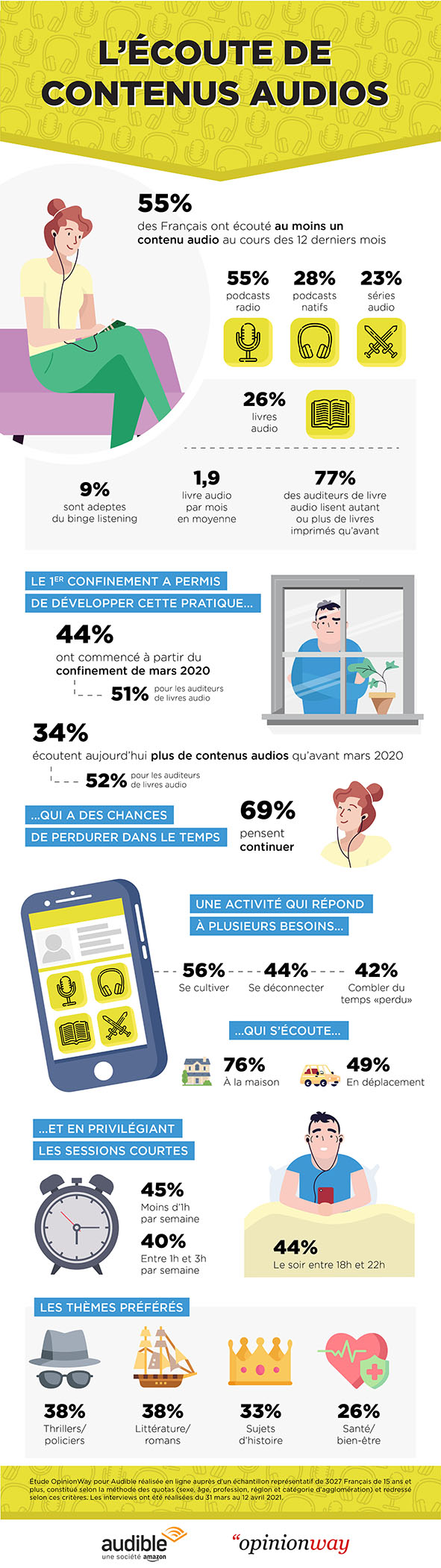 Audible, leader dans la création et la diffusion de contenus audio, dévoile son étude annuelle sur les usages des contenus audio parlés (livres audio, séries audio et podcasts natifs ou radiophoniques) en France. Réalisée par Opinion Way, l’étude Audible met en lumière l’intérêt grandissant des Français pour les contenus audio, une pratique qui tend à se démocratiser et à s’ancrer dans leur quotidien.