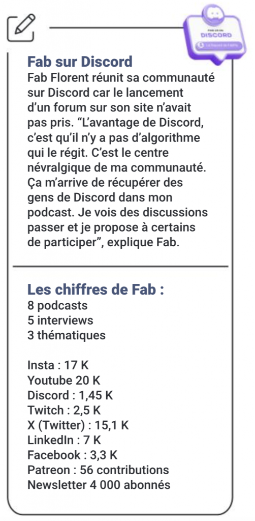Dans son canapé, le côté do it yourself permet aux invités de se sentir à l’aise. En général, il réalise une à deux interviews par jour qu’il ne considère pas comme du travail. Il enchaîne les podcasts par passion car il aime rencontrer et partager. Rien à voir avec le rythme des 30 salariés de MadmoiZelle.com. Tant que le marché pub le lui permet, Fab Florent ne compte pas arrêter de sitôt. “Je me vois bien aussi résister par rapport à la vidéo car c’est un truc qui me saoule un peu. Deux micros, deux casques, un enregistreur et c’est très bien”, assène Fab. Mais il hésite tout de même à se remettre à faire de la vidéo comme il le faisait auparavant. Côté réseaux sociaux, il teste des posts. “Parfois ça cartonne, parfois ça marche pas. Est-ce que j’ai vraiment envie de me remettre dans les mains d’un algorithme que je maîtrise pas ? Si tu sais pas trop où tu veux aller, va là où tu as envie d’aller. Je vois des mecs cartonner sur TikTok mais j’ai aucune envie d’aller sur cette plateforme”, indique Fab. “Mais, si ça se trouve, dans 6 mois je serai sur TikTok”, assène-t-il.