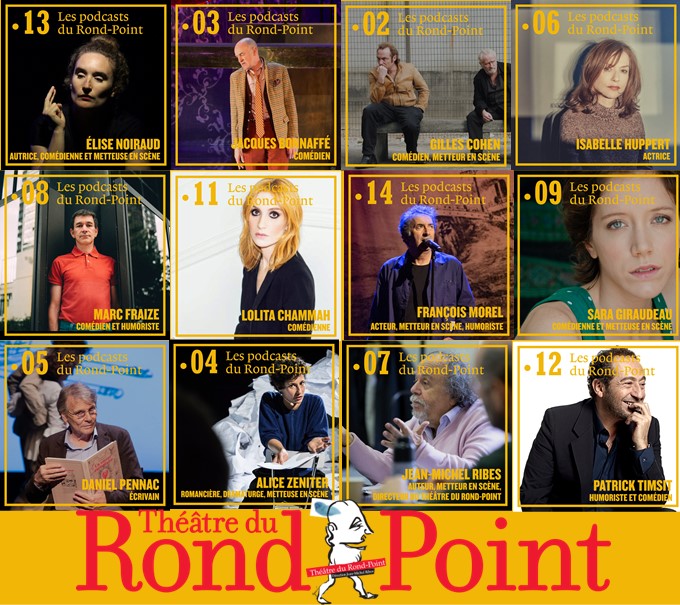 Le Rond-Point possède également sa chaîne de podcasts. Pierre Notte, auteur associé du Théâtre du Rond-Point, rencontre des artistes emblématiques du spectacle vivant. Scénographes, metteur.euse.s en scène, comédien.ne.s et autres évoquent les éléments essentiels de leur parcours et de leur univers : François Morel, Patrick Timsit, Tania de Montaigne, Jacques Bonnaffé, Dominique Bruguière, entres autres, se confient. Le Podcast du Rond-Point est à écouter ICI