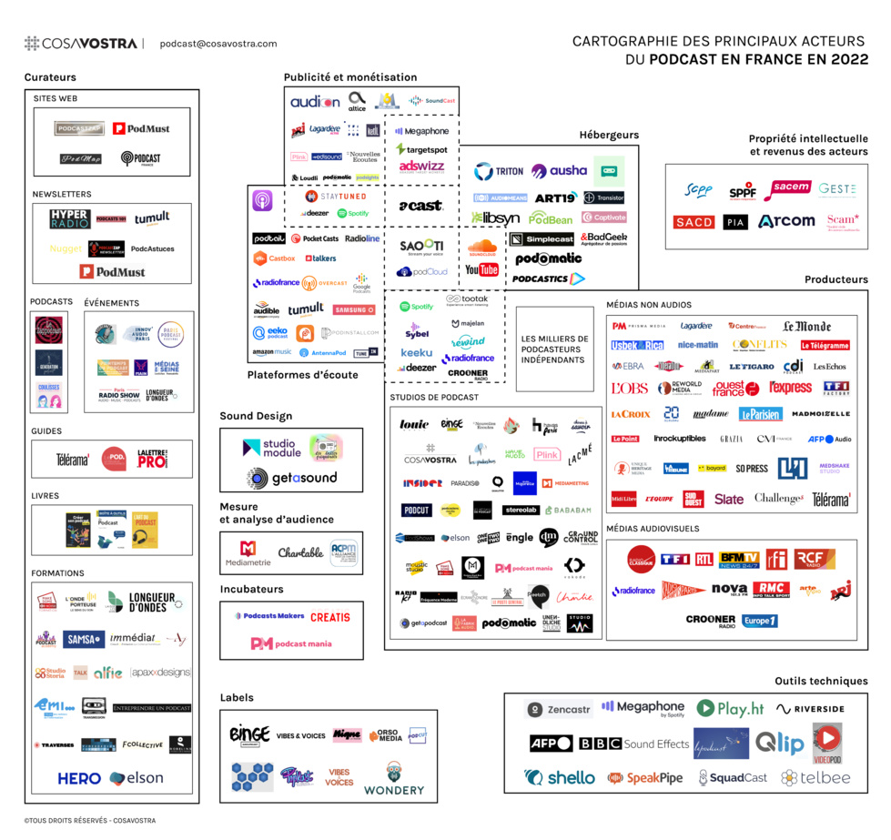 Dans cette cartographie, publiée pour la quatrième année consécutive, CosaVostra a mis un point d’honneur à répertorier les principaux acteurs du podcast en France. Une nouvelle édition actualisée, réorganisée et augmentée avec de nouvelles catégories telles que les outils techniques, les labels, les livres et les formations.