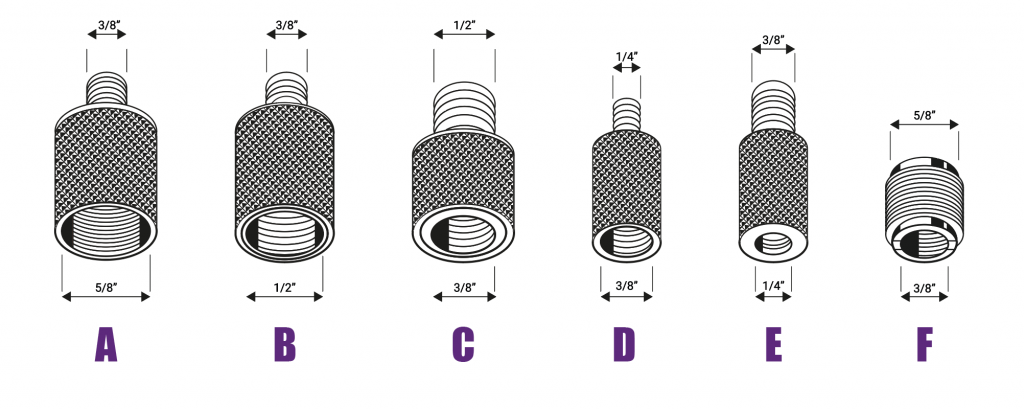 Le F est un réducteur de filetage 5/8” (M) vers 3/8” (F) souvent fourni avec les micros.