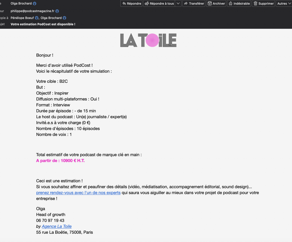 Après avoir cliqué, bien que cela ne soit pas très visible que le mail soit vraiment parti depuis le site web de PodCost™, voici le mail qui est envoyé avec le récapitulatif … et les coordonnées de La Toile si vous désirez avoir plus d’infos … 😉 bien joué Pénélope.