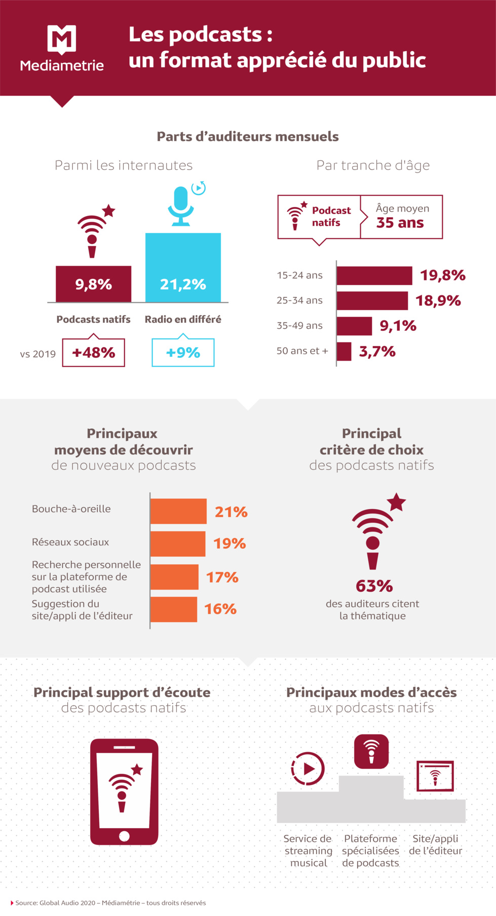 Comment les internautes choisissent-ils leurs podcasts ? Là encore Médiamétrie a des chiffres : 63% des auditeurs se basent sur le contenu, avant la marque éditrice ou la présence de personnalité.