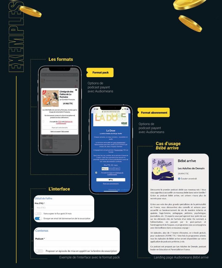 Les packs : les auditeurs payent pour une série finie d’épisodes, offrant ainsi au moment du paiement l’intégralité du contenu.