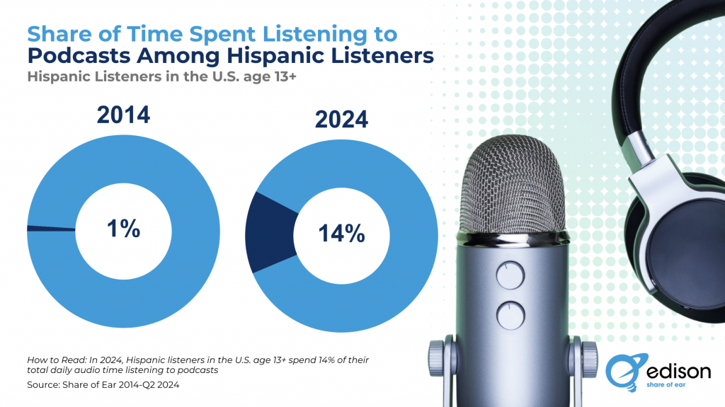 En 2014, le podcasting n’était qu’une petite tache dans le paysage de la consommation audio des Latinos, représentant 1% de leurs quelque cinq heures d’écoute audio quotidienne. Une décennie plus tard, le podcasting est désormais carrément dans l’orbite audio des Latinos américains : les Latinos passent 14% de leur temps à écouter des podcasts, un record et plus important que la part de 9% du podcasting parmi la population non latino.