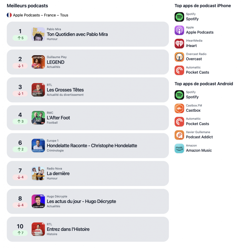 Listen Notes a pris le relais — bourré de publicités et qui vous vend des données sensibles comme le mail lié au podcast ou autres informations issues du flux RSS — et de nombreux utilisateurs se sont dirigés vers cette solution, à laquelle il faut s’inscrire pour découvrir des informations sur les classements de tous les podcasts et bien plus encore. PodcastAI, que nous avons déjà présenté sur PodcastMagazine.fr, est un hébergeur qui propose également de vous faire gagner 80 % de votre temps de post-production grâce à l’utilisation de l’IA. L’hébergeur vient de lancer un classement des meilleurs podcasts (Apple Podcast seulement à l’heure où nous rédigeons ces lignes) et des diagrammes très intéressants. Suivez votre position dès maintenant.
