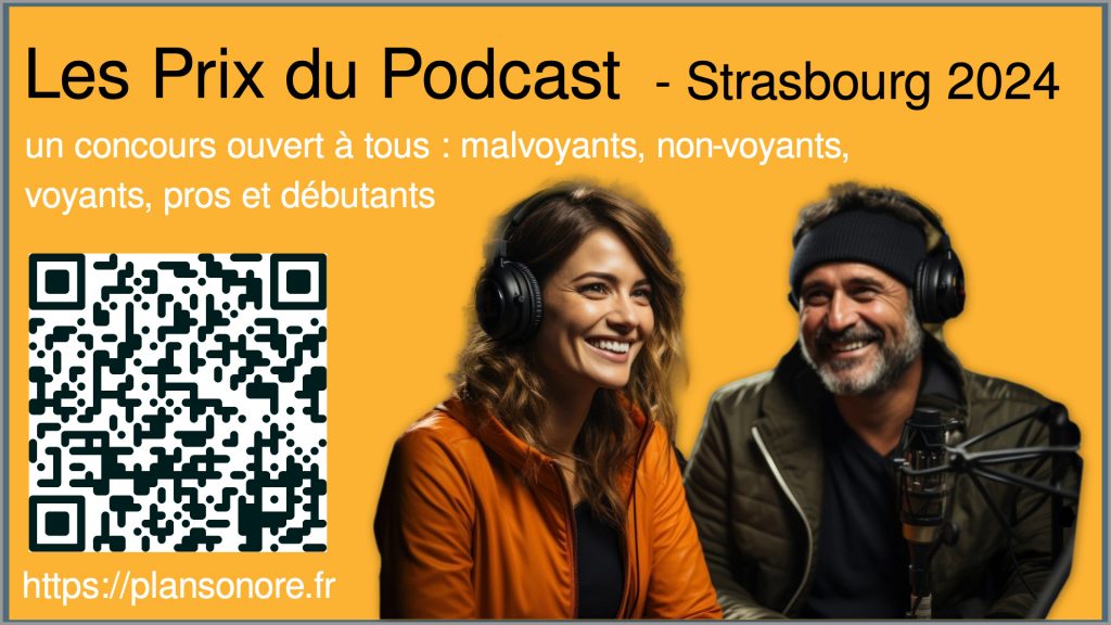 Les Prix du Podcast – Strasbourg 2024, c’est un grand concours de podcasts audio francophones entre malvoyants, non-voyants et voyants, proposé par l’association Vue (d)Ensemble et Plan Sonore dans le cadre de la 6ème édition du Festival Entendez-Voir ! du 4 au 9 juin 2024 à Strasbourg.